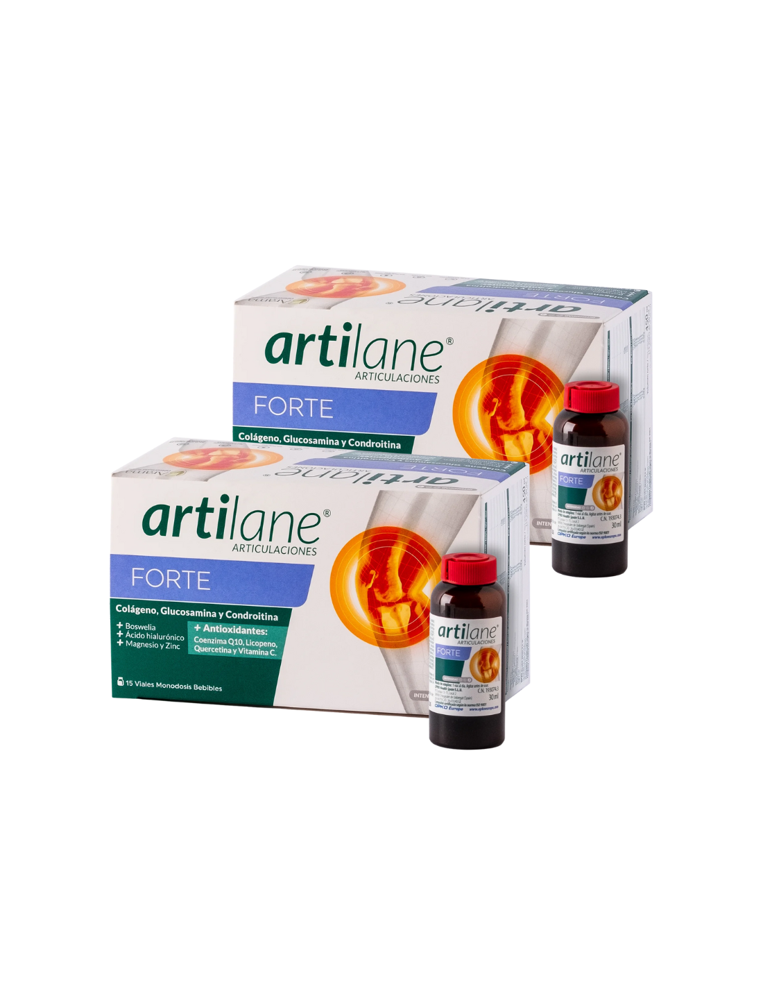 Artilane Forte Pack 2x15 Viales Monodosis es un complemento alimenticio a base de Glucosamina y Condroitina, Colágeno hidrolizado enzimáticamente de alta pureza, extracto de Boswellia serrata, con conocidas propiedades antiinflamatorias, Ácido hialurónico, Magnesio y Zinc, y antioxidantes como Coenzima Q10, Licopeno, Quercetina y Vitamina C.