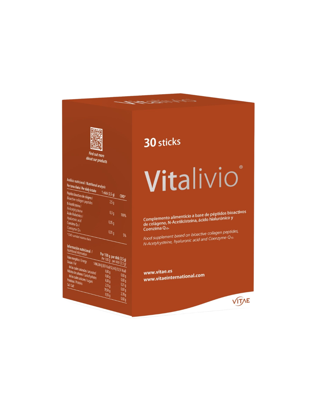 VITAE Vitalivio Sticks contiene por stick: Péptidos bioactivos de colágeno (2,5 g), N-acetilcisteína (0,3 g), Ácido hialurónico (0,05 g), Coenzima Q10 (0,01 g), Inulina, Ácido cítrico (regulador de acidez), Ácido málico (regulador de acidez), Aroma de mandarina, Beta-caroteno (colorante), Steviolglicósidos (edulcorante). Esta fórmula vegana, sin gluten, lactosa ni organismos genéticamente modificados (OGM), combina ingredientes naturales de alta biodisponibilidad para proteger los tejidos conectivos, reducir la inflamación y mejorar la movilidad articular, ofreciendo un apoyo antioxidante y regenerador con un sabor agradable y fácil disolución.