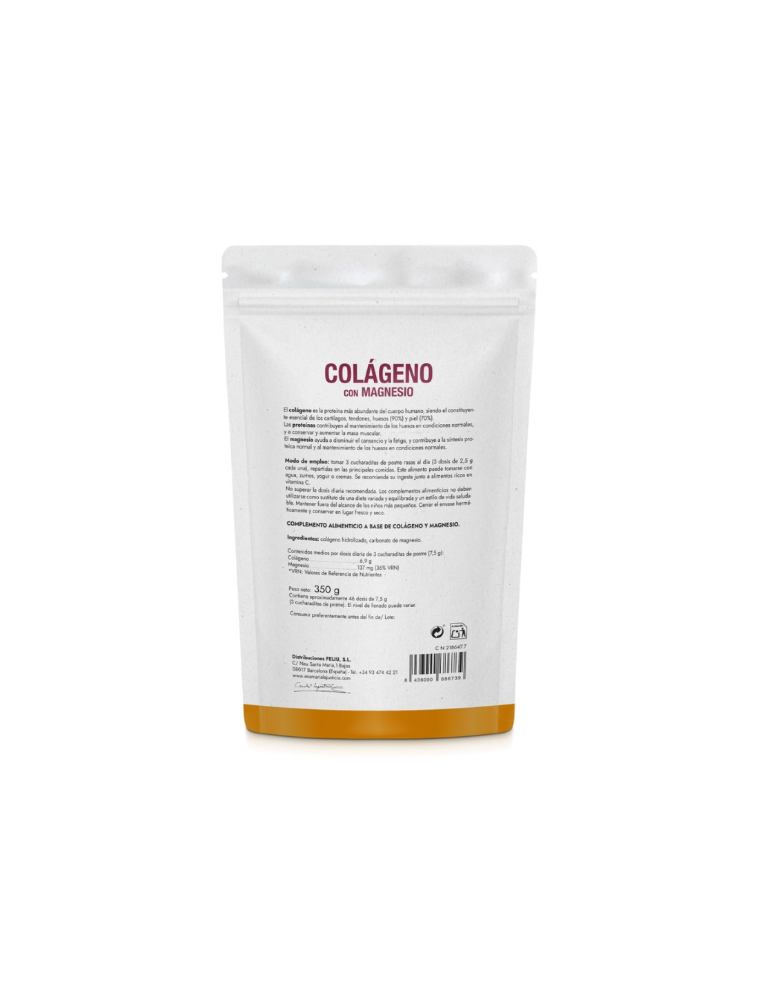 ANA MARÍA LAJUSTICIA Colágeno con Magnesio Polvo Sabor Neutro contiene: Colágeno hidrolizado tipo I y II, carbonato de magnesio.