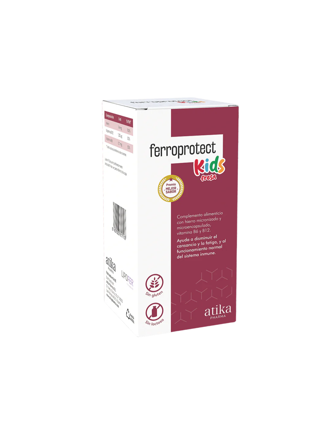 Ferroprotect Kids Fresa incluye: agua, sacarosa, maltodextrina, Lipofer ® almidón de maíz, pirofosfato férrico, emulgente (lecitina de girasol), espesante (goma xantana), conservadores (benzoato sódico y sorbato potásico), aroma, cianocobalamina (Vitamina B12), clorhidrato de piridoxina (Vitamina B6).