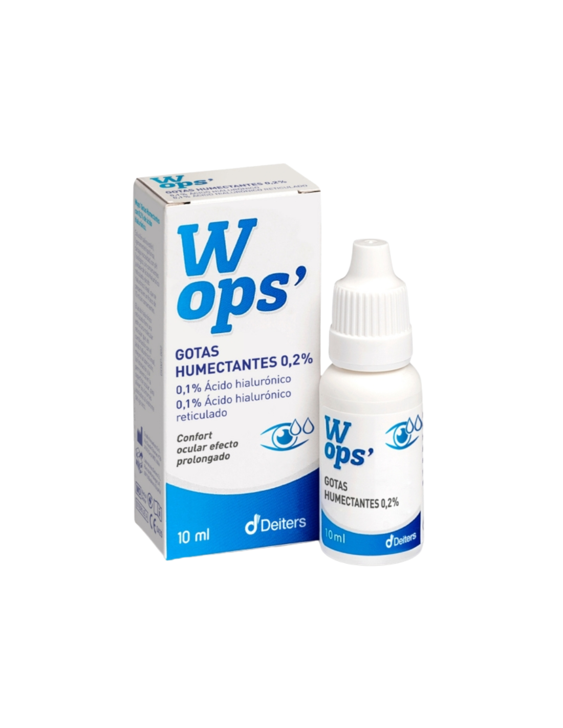 WOPS’ Gotas Humectantes 0,2% son una solución oftálmica lubricante, con hialuronato sódico de alto peso molecular (componente natural del humor vítreo y lágrima). Proporciona hidratación intensa y duradera, aliviando al instante la sequedad ocular, irritación, fatiga y molestias por aire acondicionado, pantallas o lentillas. Refresca delicadamente sin visión borrosa ni recuperación visual lenta. Compatibles con todo tipo de lentes de contacto (blandas y rígidas). Formato multidosis estéril de 10 ml, ideal para uso diario frecuente en ojos sensibles o con síndrome del ojo seco moderado.