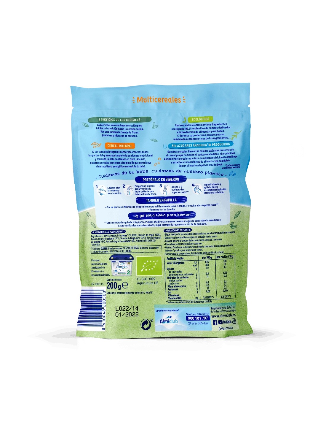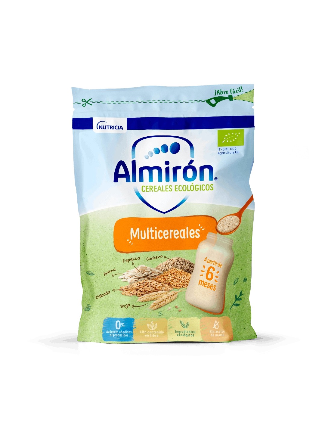 ALMIRON Multicereales ECO forma parte de una dieta equilibrada y variada. Se recomienda seguir siempre las indicaciones del pediatra antes de introducir nuevos alimentos en la alimentación del bebé. Conservar el producto en un lugar fresco y seco, bien cerrado, y consumirlo dentro del plazo indicado en el envase una vez abierto. No utilizar si el envase está dañado.