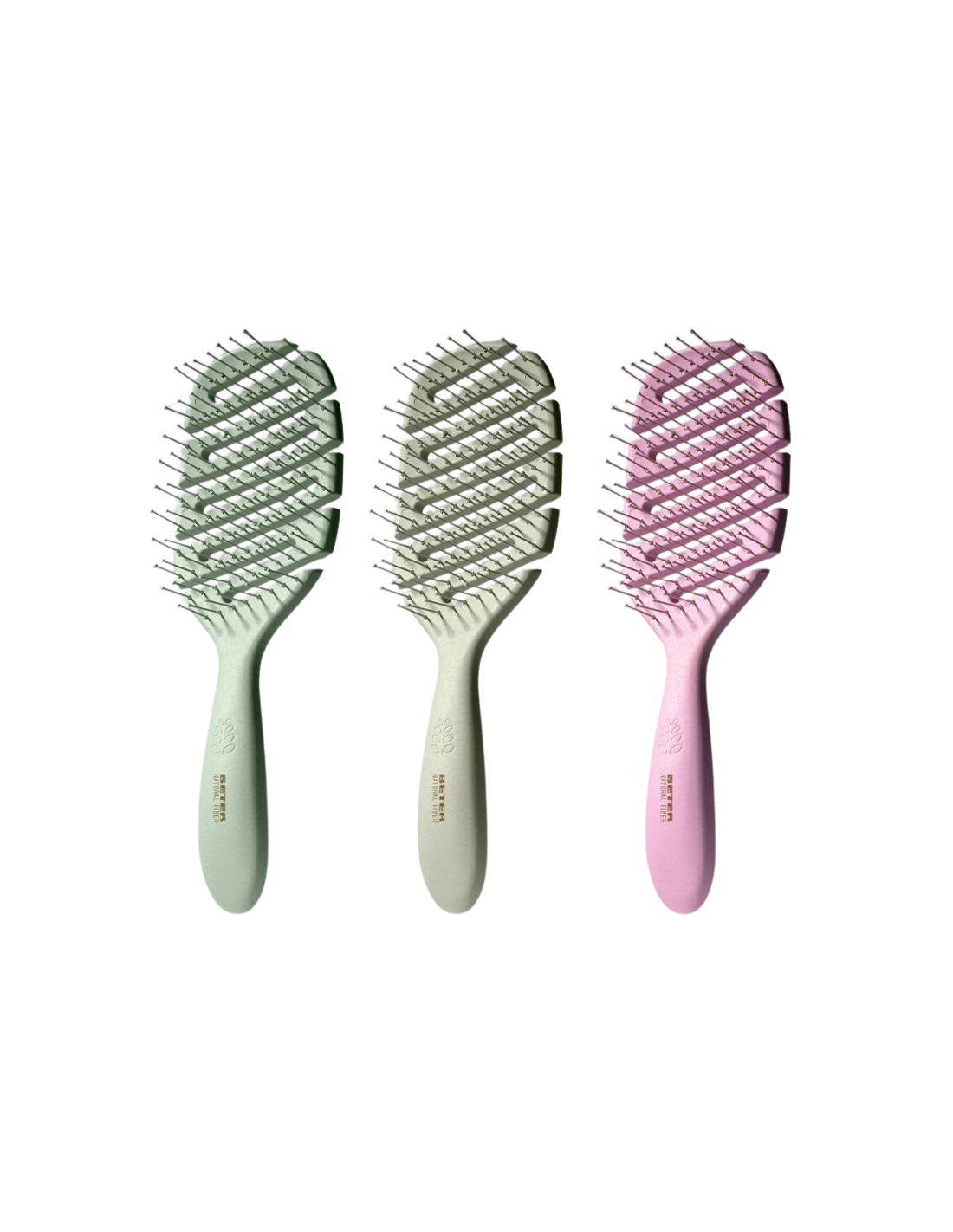 BETER Natural Fiber Cepillo Esqueleto Flexible está fabricado con materiales ecológicos y duraderos, incluyendo un cuerpo de plástico reciclado combinado con fibras de trigo naturales (biodegradables) para el mango y la estructura esquelética. Las cerdas están hechas de fibras naturales derivadas de trigo, ofreciendo una alternativa vegana y sostenible a las cerdas tradicionales. Libre de componentes de origen animal y químicos nocivos, este cepillo refleja un compromiso con el medioambiente, presentado en un diseño ligero y ergonómico que asegura un peinado cómodo y respetuoso con el cabello.