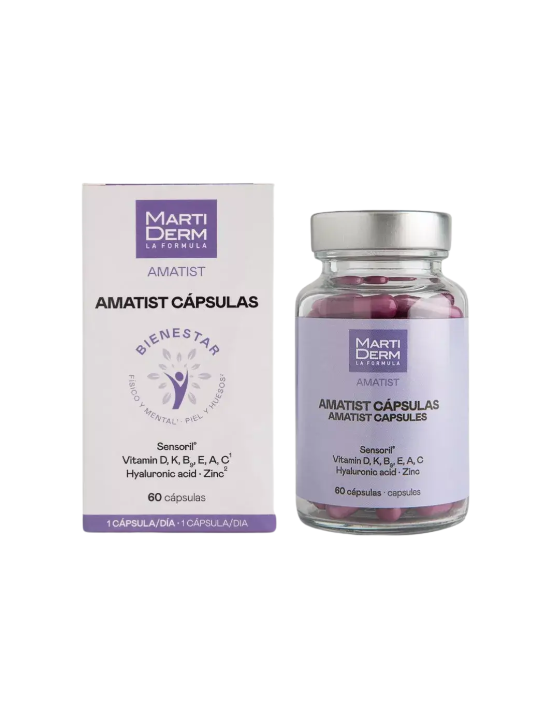 MARTIDERM Amatist Cápsulas combina ácido hialurónico para mejorar la hidratación y elasticidad de la piel, antioxidantes que protegen frente al estrés oxidativo, vitaminas D3 y K2 que contribuyen a la salud ósea y articular, zinc para el funcionamiento metabólico y extracto de Ashwagandha, un adaptógeno que ayuda a reducir estrés, fatiga e insomnio, mejorando la función cognitiva y el bienestar general.
