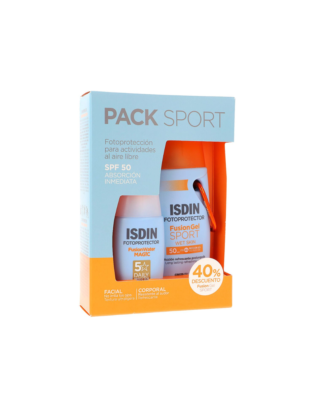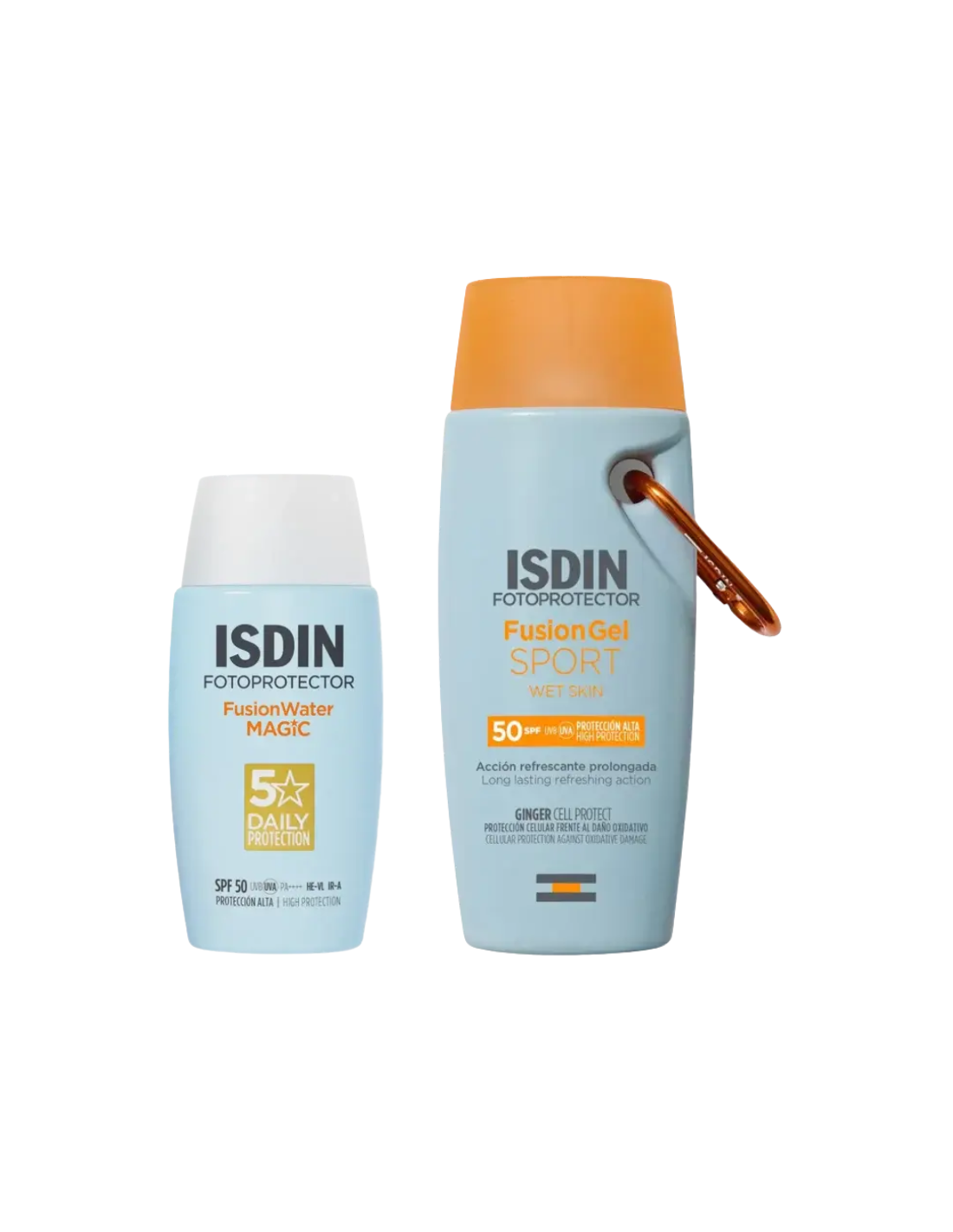 ISDIN Pack Sport Fotoprotector SPF50 es un pack solar de alto rendimiento diseñado para ofrecer protección completa en actividades al aire libre, combinando un fotoprotector facial ultraligero con un gel corporal resistente al agua y al sudor. Este conjunto proporciona una defensa eficaz frente a la radiación UVA y UVB gracias a su tecnología Full Spectrum, ayudando a prevenir el daño solar y el fotoenvejecimiento. El fluido facial destaca por su textura acuosa, que se funde con la piel sin dejar residuo ni picar en los ojos, mientras que el gel sport aporta frescor inmediato y una gran adherencia incluso en condiciones de humedad o de sudoración, siendo ideal para deportistas o exposiciones intensas.