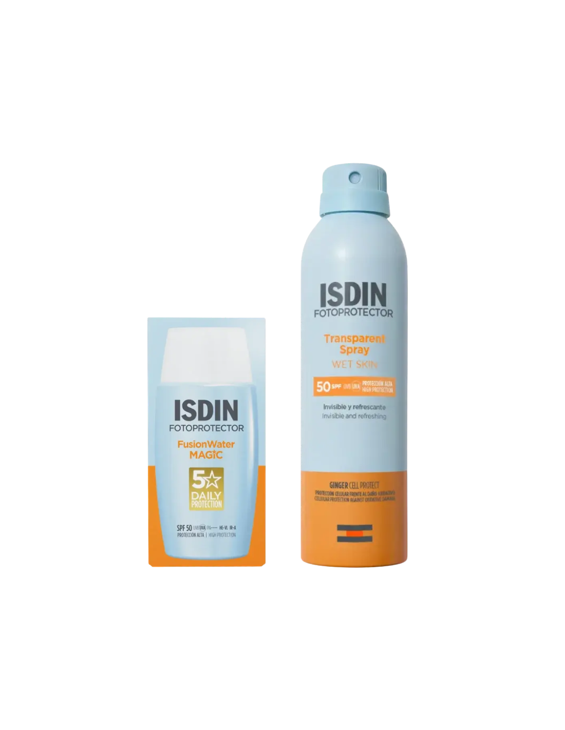ISDIN Pack Fotoprotectores Facial y Corporal SPF50 es un pack de protección solar completa que combina un fotoprotector facial ultraligero y un protector corporal en spray transparente, ofreciendo alta protección frente a la radiación UVA y UVB para el cuidado diario de toda la piel. Incluye el protector facial ISDIN Fusion Water Magic SPF50 50 ml, con textura acuosa ultraligera que se absorbe de forma inmediata sin dejar residuos grasos ni irritar los ojos, y el protector corporal ISDIN Transparent Spray Wet Skin SPF50 250 ml, un spray transparente que puede aplicarse incluso sobre piel mojada. Este pack mantiene la hidratación cutánea y previene el fotoenvejecimiento gracias a su acción antioxidante.