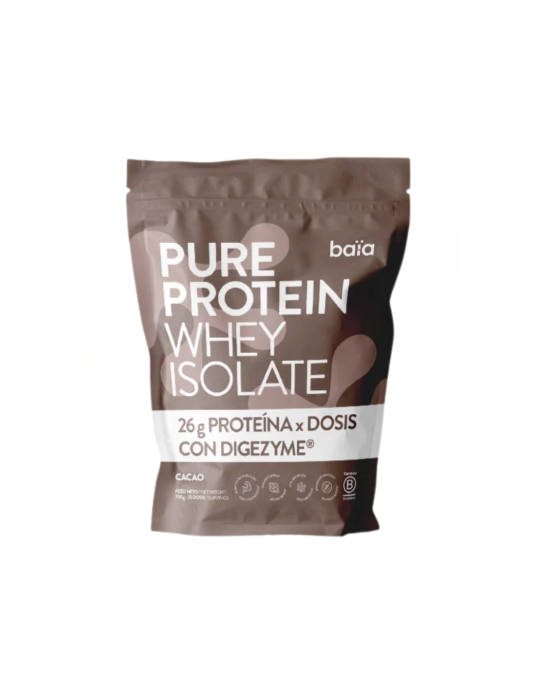 BAÏA Pure Protein Whey Isolate Cacao contiene: AISLADO DE PROTEÍNA DE SUERO DE LECHE (94.5%), CACAO EN POLVO (4.5%), COMPLEJO MULTI-ENZIMÁTICO (DIGEZYME®) Y SAL.