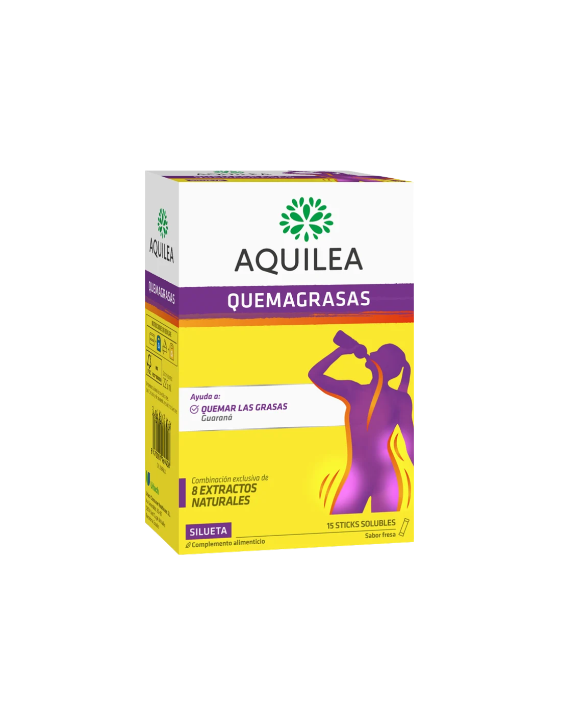 AQUILEA Quemagrasas Sticks Solubles contiene por stick: Extracto de guaraná (Paullinia cupana, fruto, 30 mg), Extracto de té verde (Camellia sinensis, hojas, 20 mg), Extracto de diente de león (Taraxacum officinale, raíz, 27 mg), Extracto de cola de caballo (Equisetum arvense, partes aéreas, 67,5 mg), Extracto de ulmaria (Filipendula ulmaria, flores, 54 mg), Extracto de hibisco (Hibiscus sabdariffa, flores, 30 mg), Extracto de rabos de cereza (Prunus cerasus, pedúnculos, 22,5 mg), Extracto de alcachofa (Cynara scolymus, hojas, 23,3 mg), Maltodextrina (agente de carga), Ácido cítrico (regulador de acidez), Aroma de fresa, Sucralosa (edulcorante). Esta fórmula vegana, sin gluten ni lactosa, combina extractos naturales para promover el metabolismo de las grasas y la eliminación de líquidos, con un sabor refrescante.