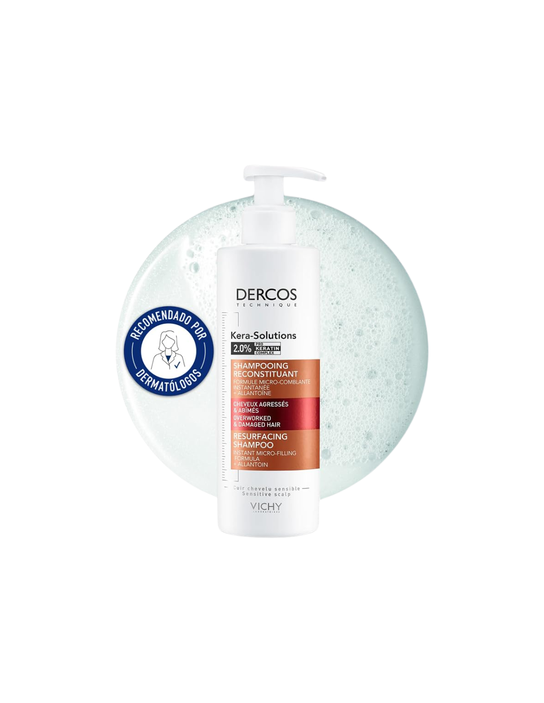 Aplique sobre el cabello húmedo, masajeando suavemente el cuero cabelludo y las hebras para crear espuma. Deje actuar durante 1-2 minutos para permitir que los ingredientes activos penetren en la fibra capilar. Enjuague abundantemente con agua tibia hasta eliminar todo el producto. Para mejores resultados, use regularmente, combinándolo con la mascarilla o el sérum de la gama Kera-Solutions de VICHY. Evite aplicar en exceso para no sobrecargar el cabello. En caso de cabello muy dañado, puede realizar una segunda aplicación durante el mismo lavado para un cuidado más intensivo.