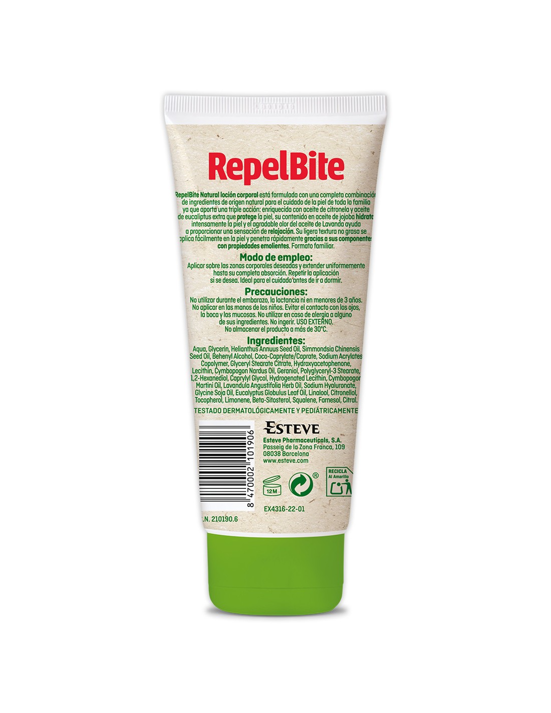 RepelBite Loción Corporal está formulada con una combinación de ingredientes de origen natural para el cuidado de la piel de toda la familia. Está enriquecida con aceite de citronela y aceite de eucaliptus que protegen la piel, su contenido en aceite de jojoba hidrata intensamente la piel. El agradable olor de aceite de lavanda ayuda a proporcionar una sensación de relajación.