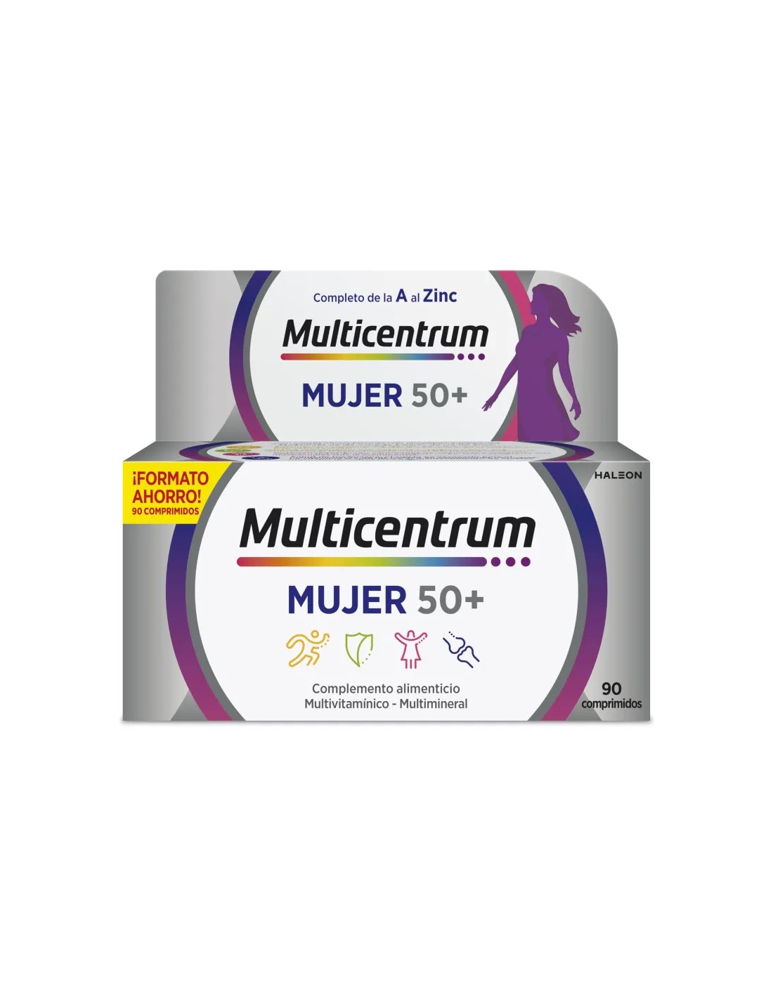 Multicentrum Mujer 50+ Comprimidos contiene vitaminas A (800 µg, 50% como betacaroteno), D (10 µg), E (16 mg), K (30 µg), C (100 mg), B1 (1,32 mg), B2 (1,75 mg), B6 (1,75 mg), B12 (3 µg), ácido fólico (300 µg), biotina (62,5 µg), niacina (20 mg), ácido pantoténico (7,5 mg), y minerales como calcio (320 mg), magnesio (100 mg), hierro (4,2 mg), yodo (100 µg), cobre (500 µg), manganeso (2 mg), cromo (40 µg), molibdeno (50 µg), selenio (30 µg) y zinc (5 mg). Incluye excipientes como celulosa microcristalina y estearato de magnesio, ofreciendo una fórmula sin gluten ni lactosa adaptada a las necesidades femeninas post-50.