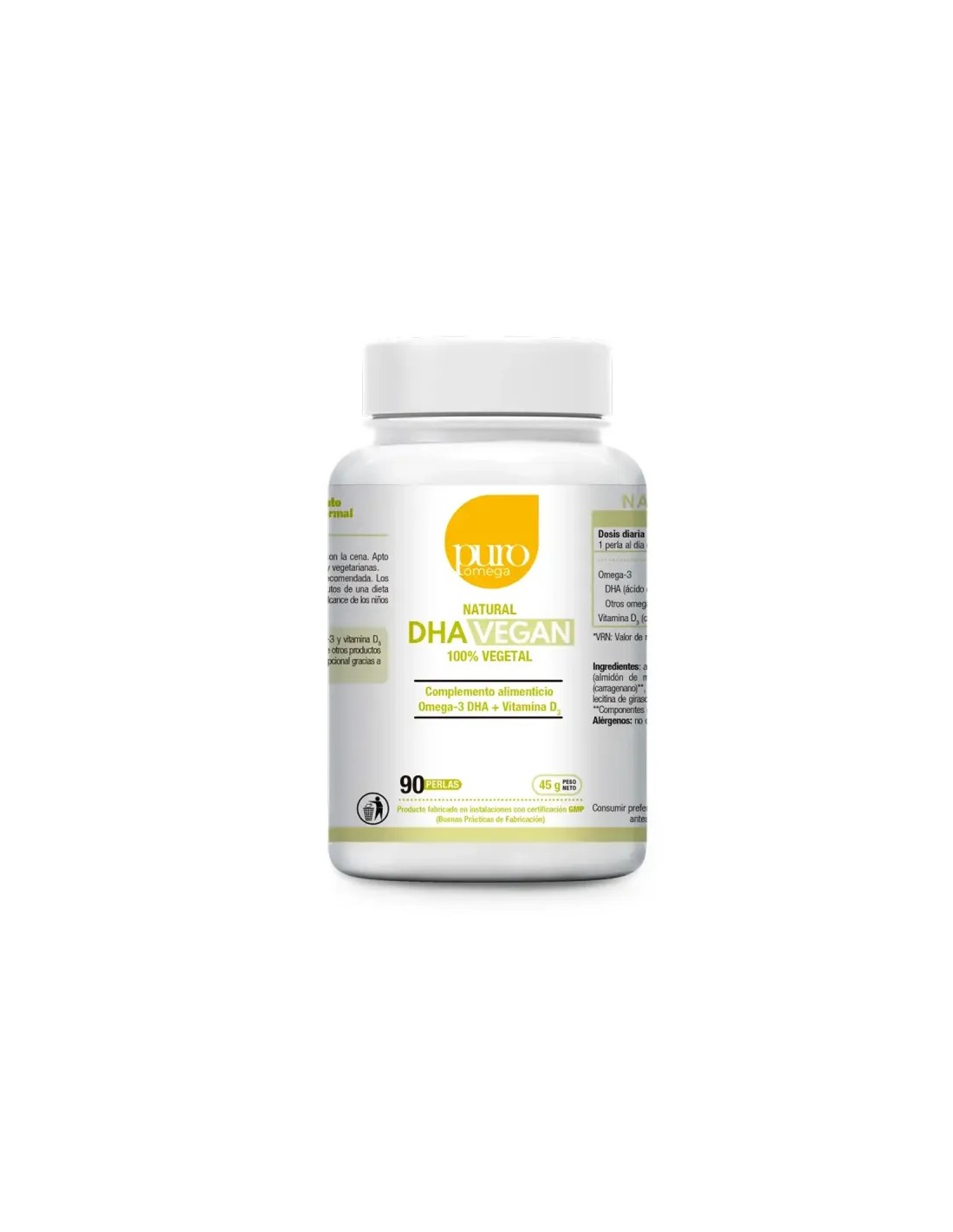 Puro omega natural Dha Vegan, 60 perlas, es un suplemento alimenticio elaborado a base de omega-3 DHA de algas. Una fórmula 100 % vegetal que aporta al buen funcionamiento del corazón, la salud articular, emocional, cutánea, gastrointestinal y emocional.