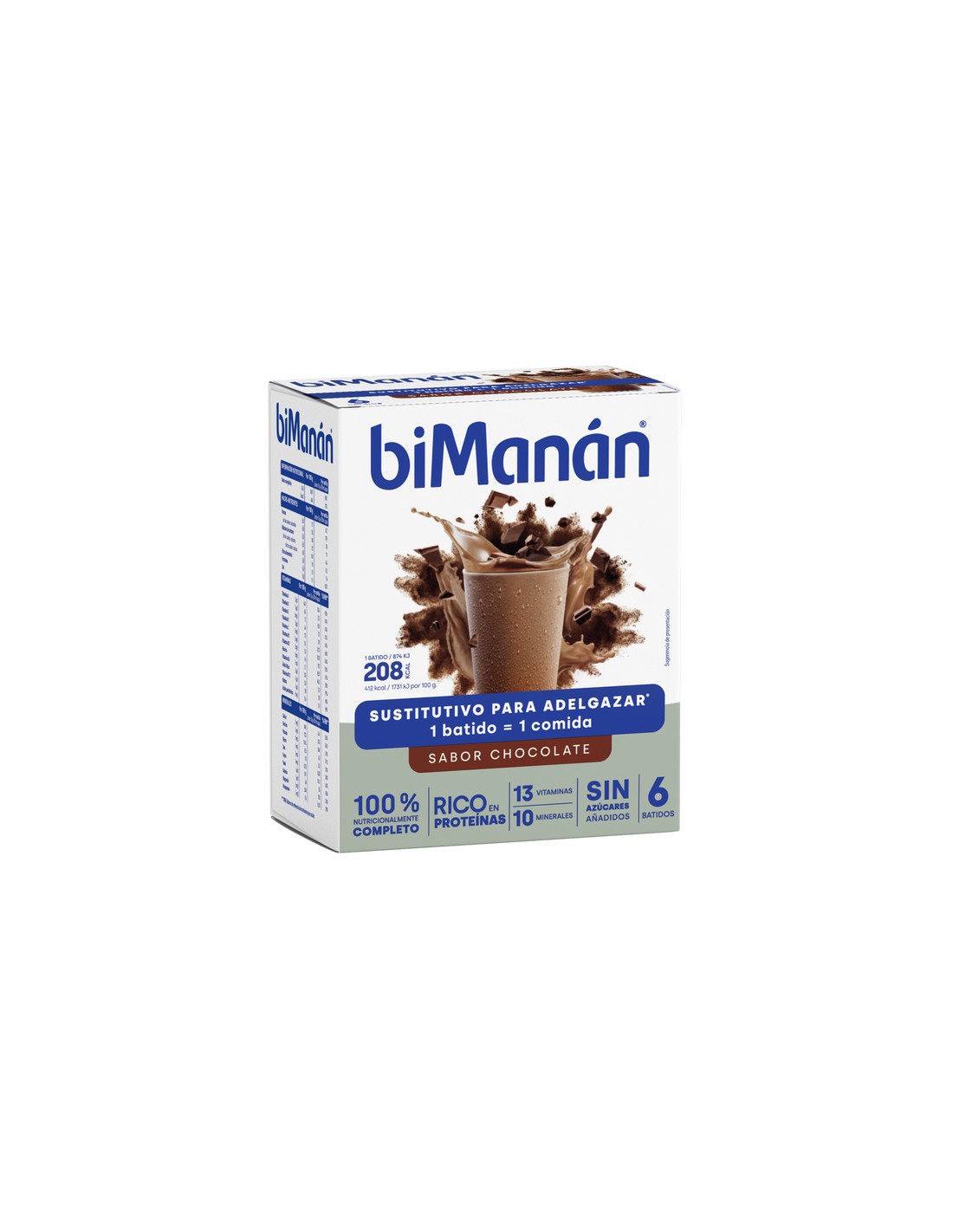 Alcanzar tus objetivos es fácil y delicioso con Bimanan Batido Sustitutivo Sabor Chocolate. Sin azúcares añadidos. Con cacao sostenible certificado. Cientificamente probado para adelgazar. El batido de chocolate aporta todos los nutrientes de una comida. Recomendaciones: La sustitución de dos de las comidas principales del día por un sustitutivo de la comida, como parte de una dieta hipocalórica, ayuda a perder peso de forma segura. El consumo de uno de estos sustitutivos al día favorece el mantenimiento del peso alcanzado. Los productos sustitutivos de comidas deben consumirse dentro del marco de una dieta variada y equilibrada de bajo valor energético, junto con otros alimentos y un estilo de vida saludable.