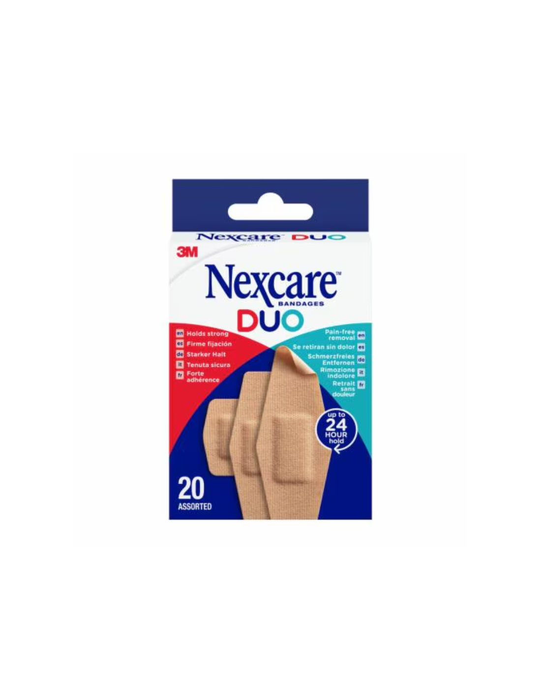 NEXCARE Tiras DUO están fabricadas con un tejido flexible de poliéster que se estira y adapta al cuerpo, combinado con un adhesivo de silicona patentado que asegura una fijación fuerte pero permite una retirada sin dolor, minimizando el daño a la piel sensible. La almohadilla central, hecha de material absorbente y no adherente, protege la herida sin pegarse a ella, mientras que el diseño de sellado de 360° incluye una capa transpirable que favorece la cicatrización. Este producto no contiene látex ni fragancias, siendo hipoalergénico y seguro para la mayoría de los usuarios, todo presentado en un surtido de 20 unidades con tamaños variados para adaptarse a diferentes necesidades.