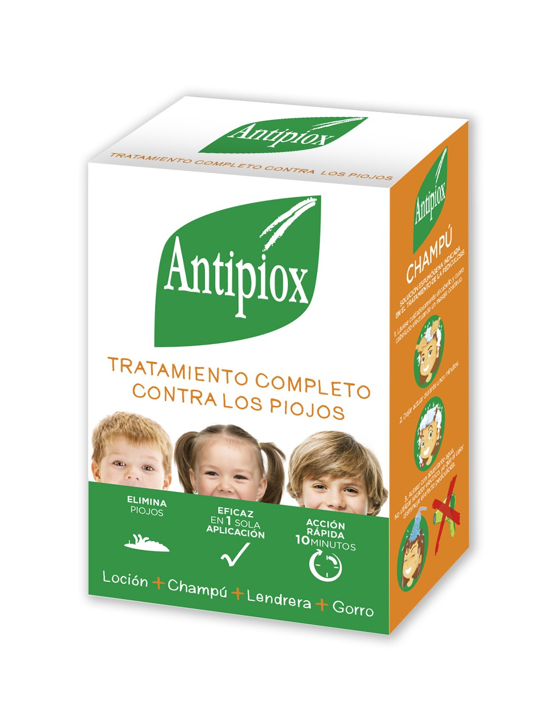 Antipiox Pack Loción + Champú + Lendrera + Gorro es un kit pediculicida integral diseñado para eliminar piojos y liendres de manera rápida y eficaz en adultos y niños mayores de 2 años. Este tratamiento combina una loción y un champú con fenotrina, un potente piretroide de última generación, que actúa paralizando el sistema nervioso de los parásitos, asegurando su eliminación en una sola aplicación de 10-15 minutos. Incluye una lendrera para retirar los piojos muertos y un gorro para potenciar la acción del producto, siendo ideal para infestaciones capilares en el hogar o entornos escolares. Con un perfume hipoalergénico y una fórmula que no deja el cabello graso ni pegajoso, este pack ofrece una solución práctica y segura para combatir la pediculosis de forma efectiva.
