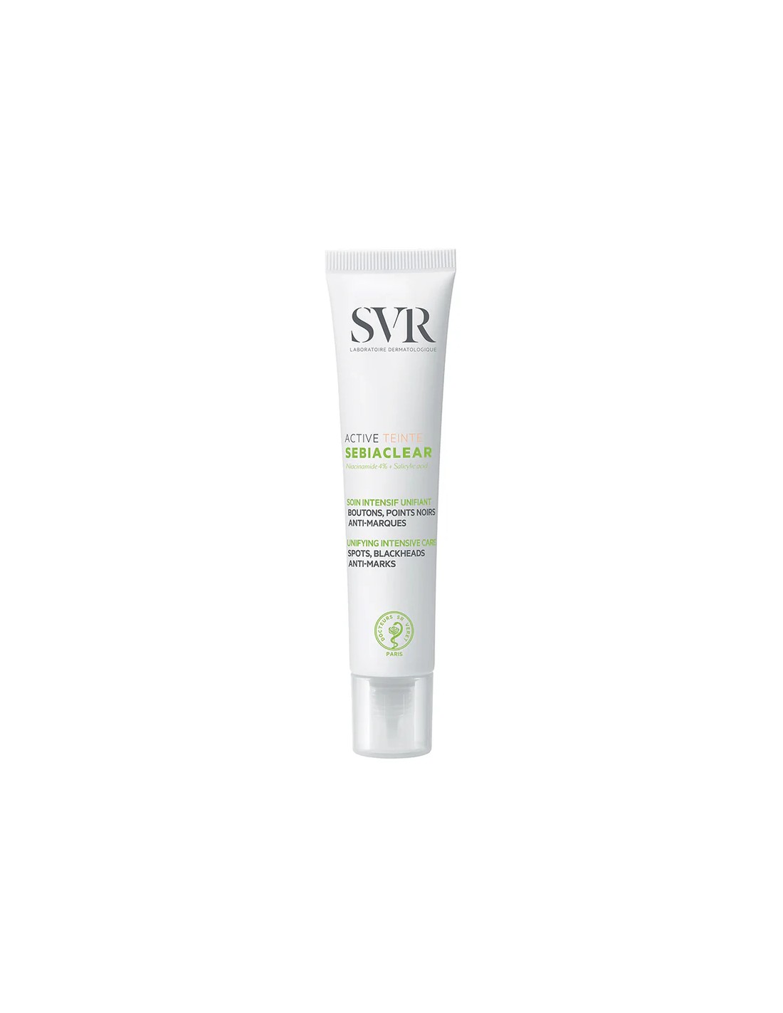 SVR Sebiaclear Active Teinté es un tratamiento unificador con color que corrige las imperfecciones y las marcas de las pieles mixtas a grasas con tendencia al acné, incluso de las pieles sensibles. SEBIACLEAR Active Teinté actúa sobre las imperfecciones camuflándolas gracias a sus pigmentos minerales micronizados. Con una textura ligera, no grasa y no pegajosa, minimiza los poros, matifica la piel y actúa sobre las marcas. Un tono universal de larga duración y cobertura que corrige la tez de forma natural.